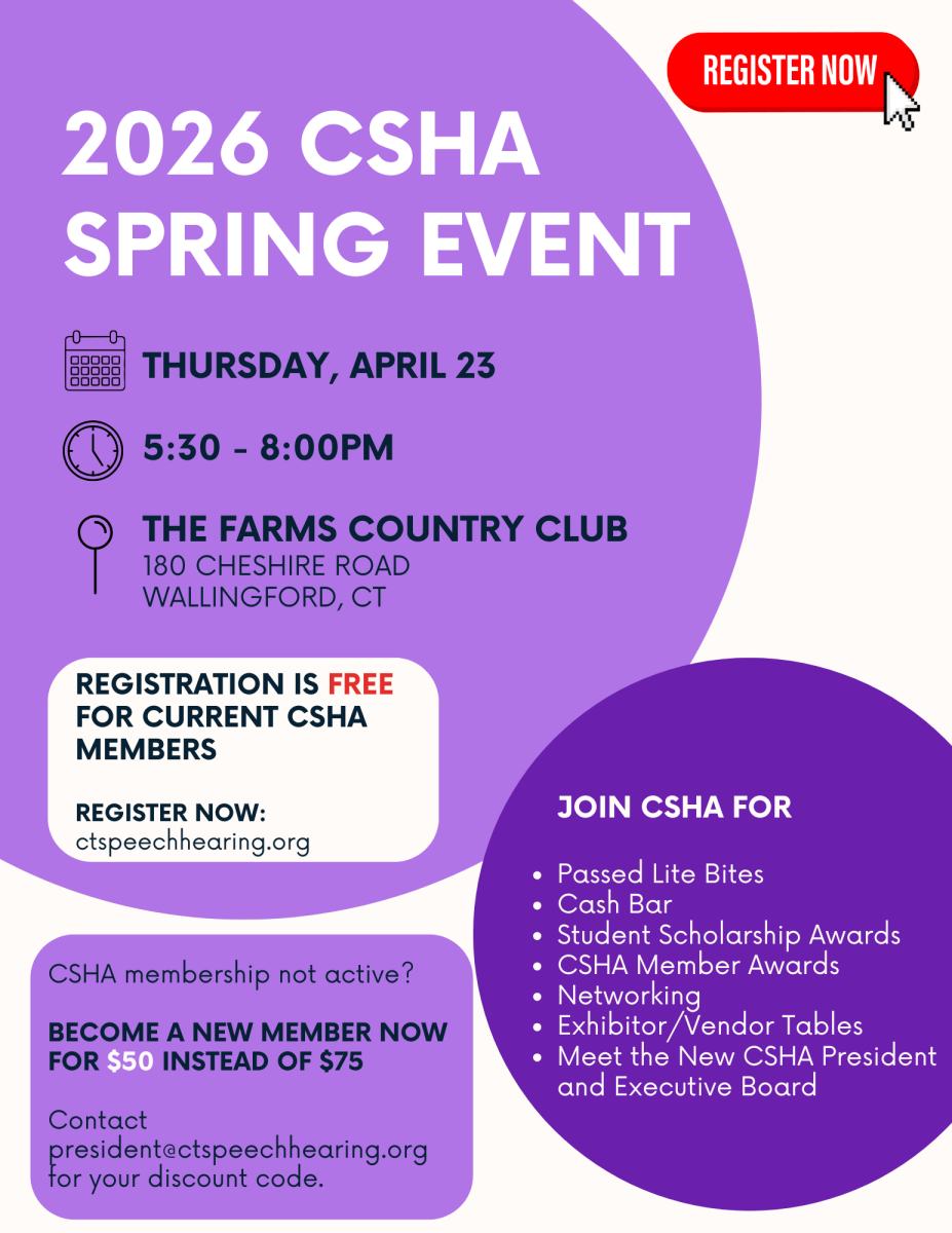 The Mission of the Connecticut Speech-Language-Hearing Association (CSHA) is to enhance the provision of quality services for people with communication disorders and their families by protecting and serving the professions of speech-language pathology and audiology in Connecticut through legislative and regulatory advocacy, opportunities for professional development, and public awareness. |